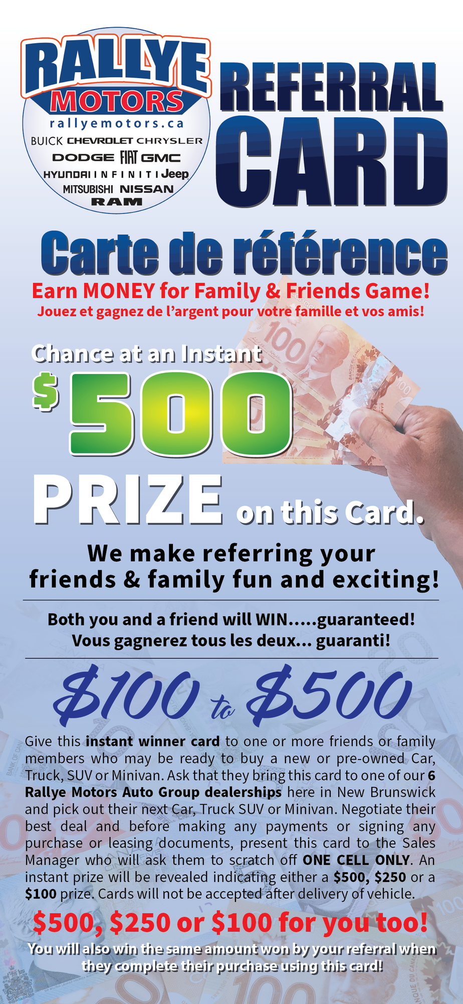 Card must be played prior to any payment made, or purchase/lease documents are signed. All taxes due are the responsibility of the winners. Odds of winning the “W” prize 400:1, “I” 40:1, and the “N” prize are 400:389.